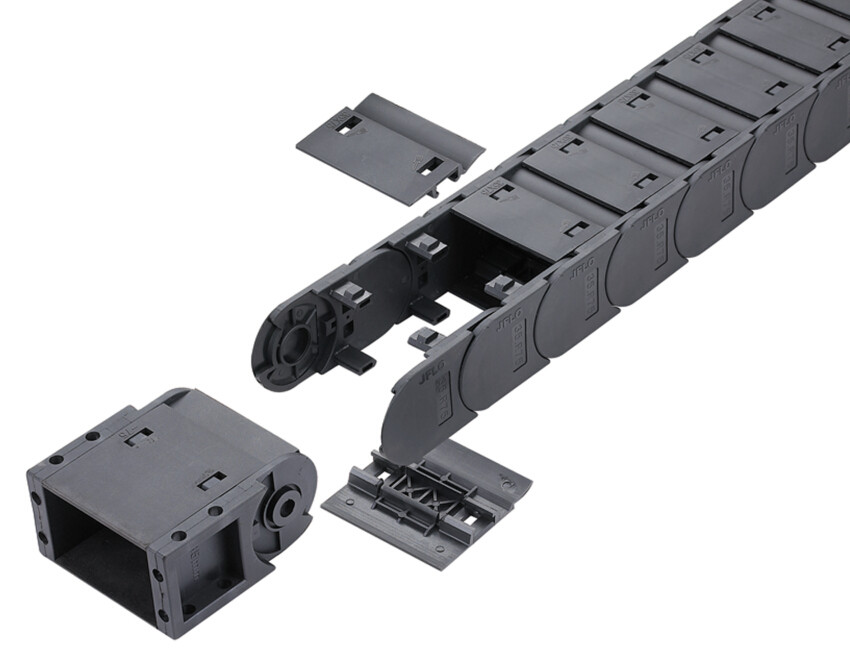 鋼鋁拖鏈適合于使用在往復運動的場合,能夠對內置的電纜、油管、氣管、水管等起到牽引和保護的作用。拖鏈的每一節都能打開,便于安裝和維修。運動時噪音低、耐磨,可高速運動。
