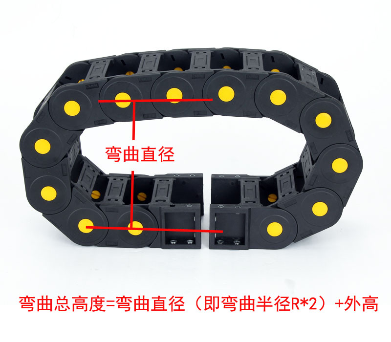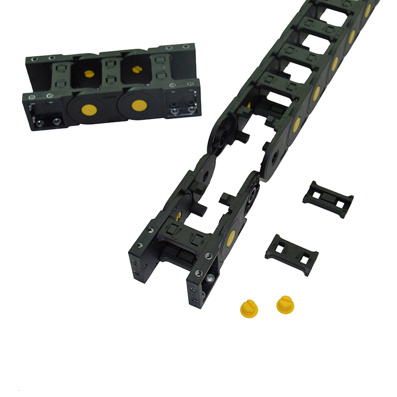 拖鏈采用四片(即兩側(cè)主體與上下橫梁或封閉片)組裝起來,四片可以自由打開與組裝。組裝后兩側(cè)鏈板用黃扣加緊,使結(jié)構(gòu)更加堅(jiān)固,在外觀上也更加美觀。